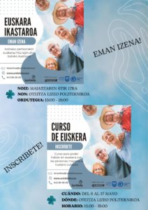 ADINEKO PERTSONEKIN EUSKARAZ HITZ EGITEKO IKASTAROA apirila / 25, 2024 Noiz: Maiatzaren 6tik 17ra Non: Oteitza Lizeo Politeknikoa Ordutegia: 15:00 – 18:00