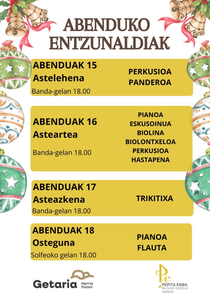 Abe 15astelehena Abe 18osteguna 18:00 Bandako gelan ENTZUNALDIAK, PEPITA ENBIL MUSIKA ESKOLAN Musika Pepita Enbil Musika Eskola