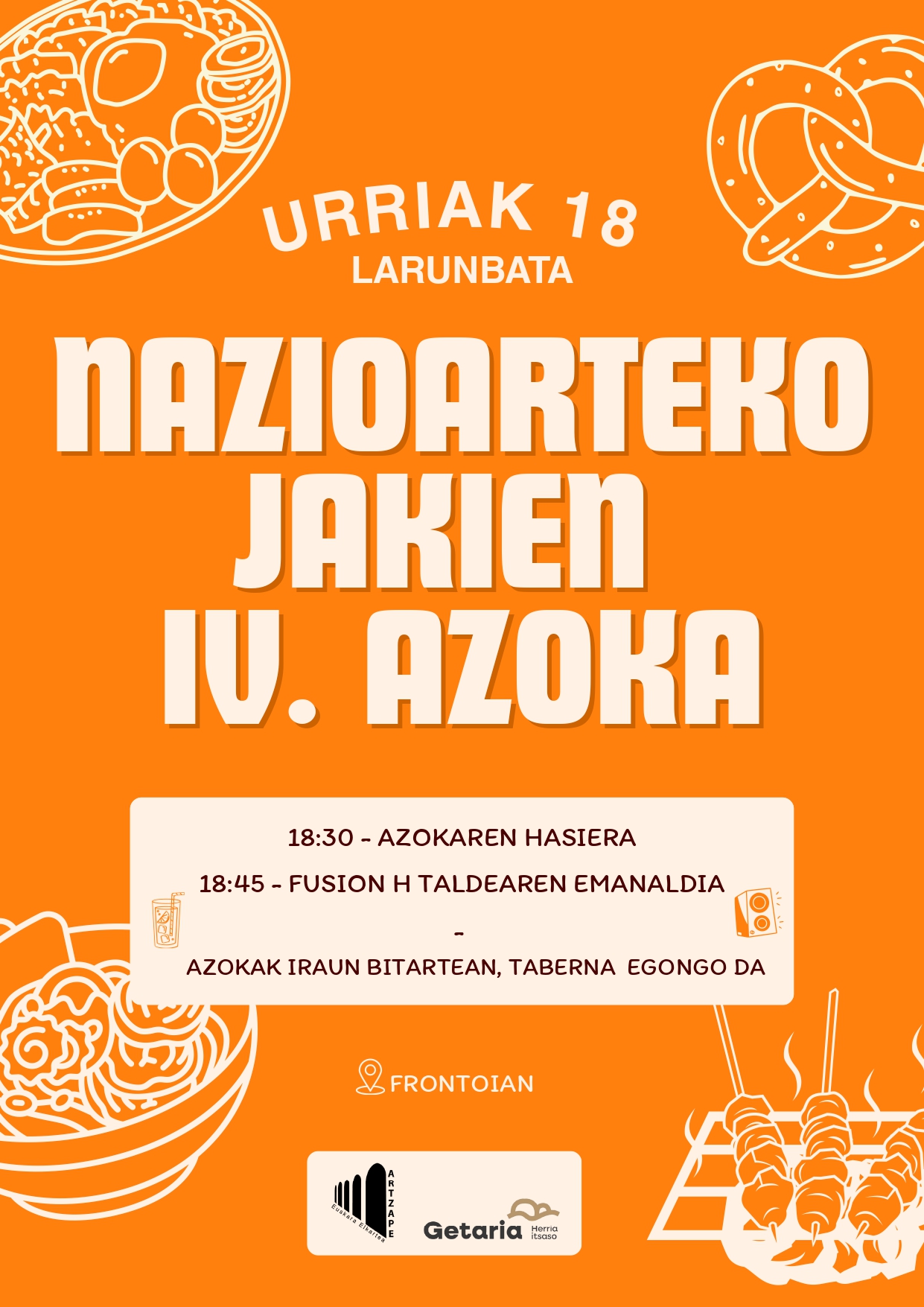 Urr 18larunbata 18:30-20:30 NAZIOARTEKO JAKIEN IV. AZOKA 18:30 AZOKAREN HASIERA 18:45 FUSION H TALDEAREN EMANALDIA *** Azokak iraun bitartean, taberna egongo da. Artzape Euskara Elkartea/Udala