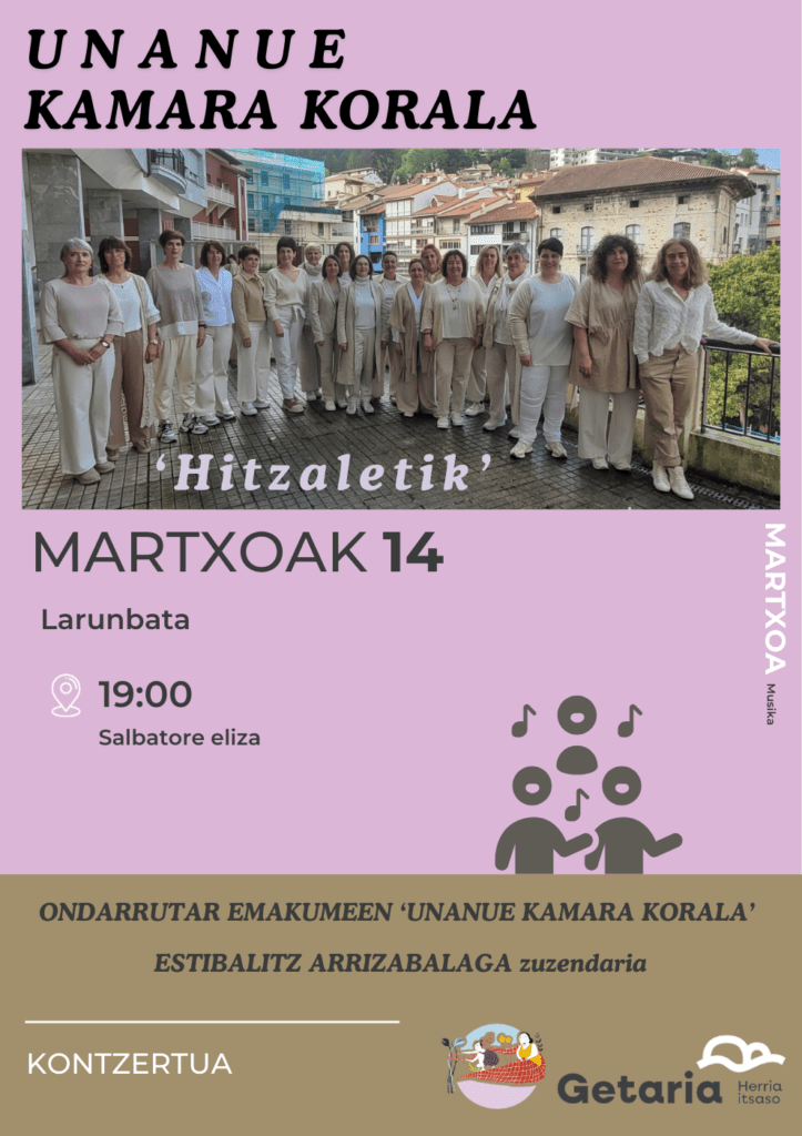Mar 14larunbata 19:00 Salbatore Eliza ONDARRUTAR EMAKUMEEN ‘UNANUE KAMARA KORALA’ Musika ‘HITZALETIK’_egitaraua_2026.03.14_1 Getariako Ahalduntze Taldea / Udala