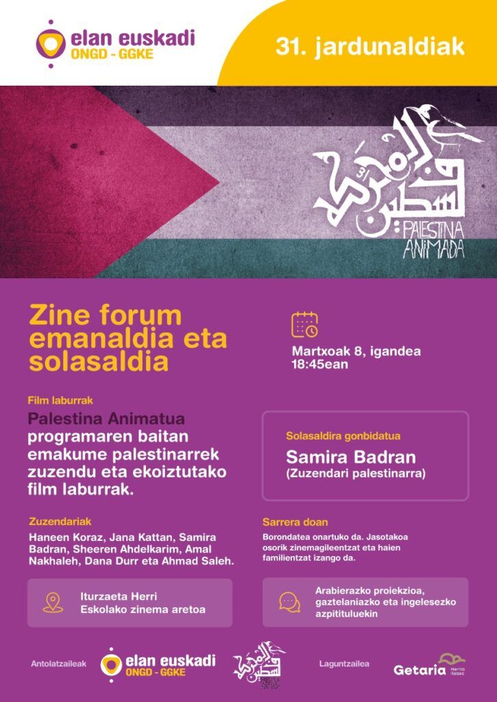 Palestinar emakume zinemagileek zuzendutako animaziozko film laburren emanaldia eta solasaldia.