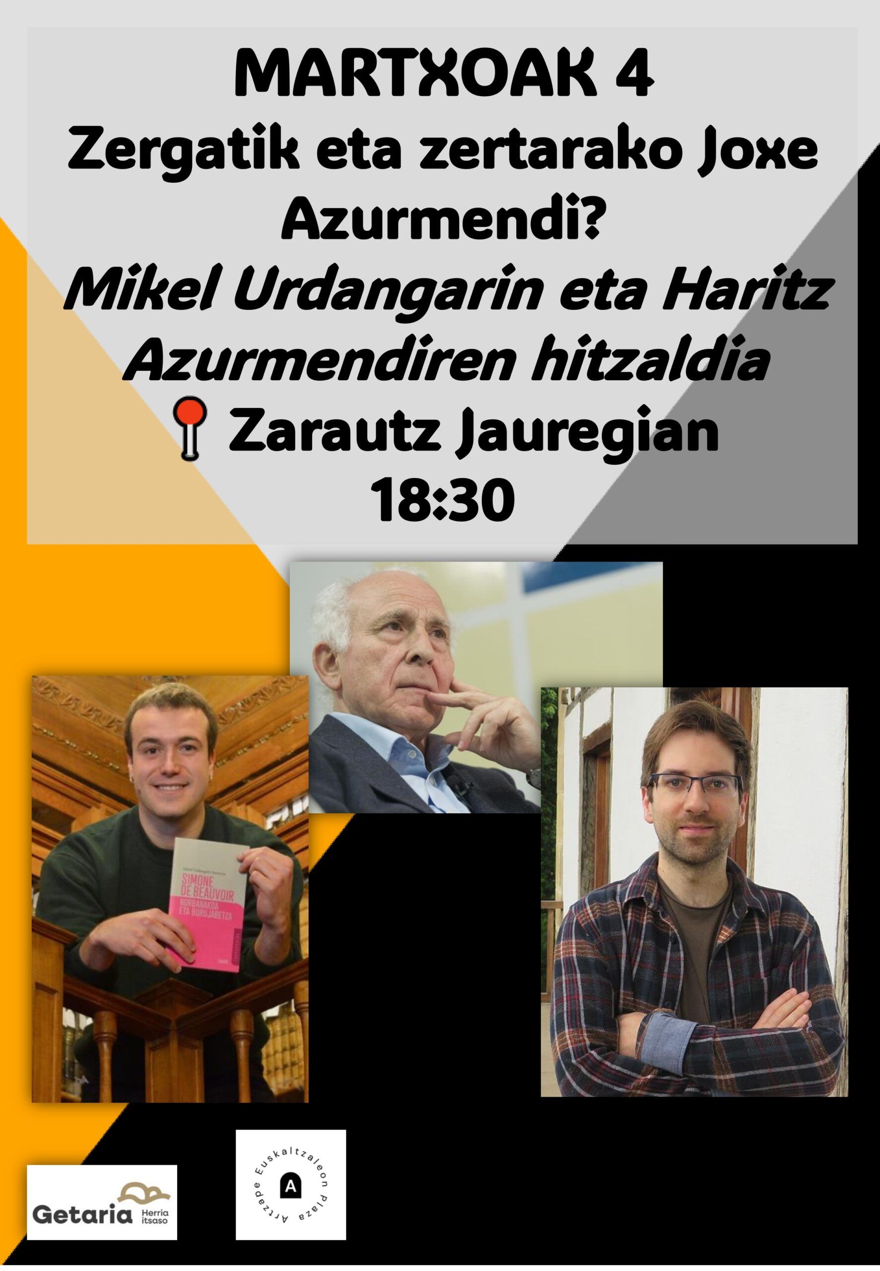 Mikel Urdangarin eta Haritz Azurmendi filosofoek Joxe Azurmendiren ekarpenari eta lanari buruz hitz egingo dute.