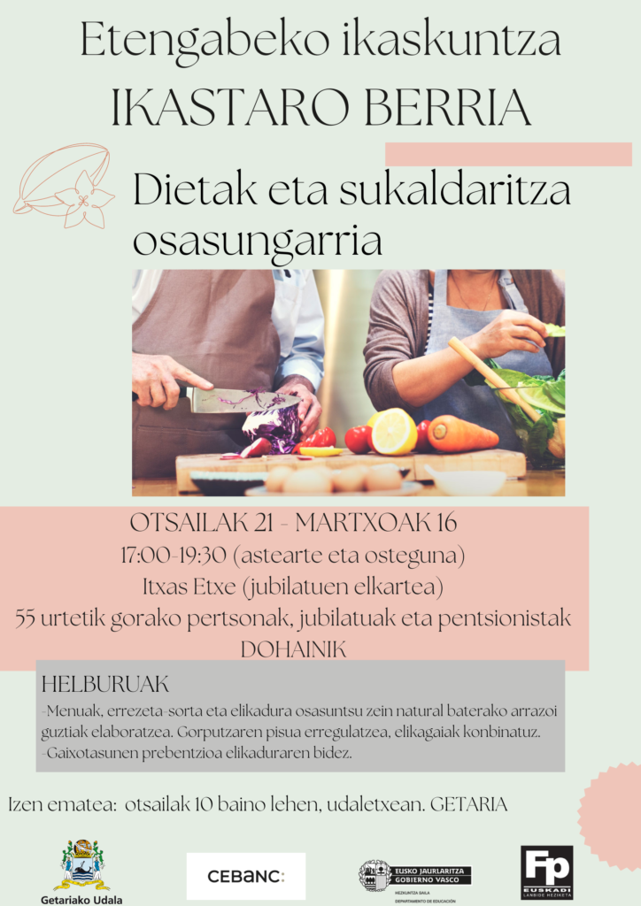 - DIETAK ETA SUKALDARITZA OSASUNGARRIA, otsailaren 21etik martxoaren 16ra (20 orduko ikastaroa)