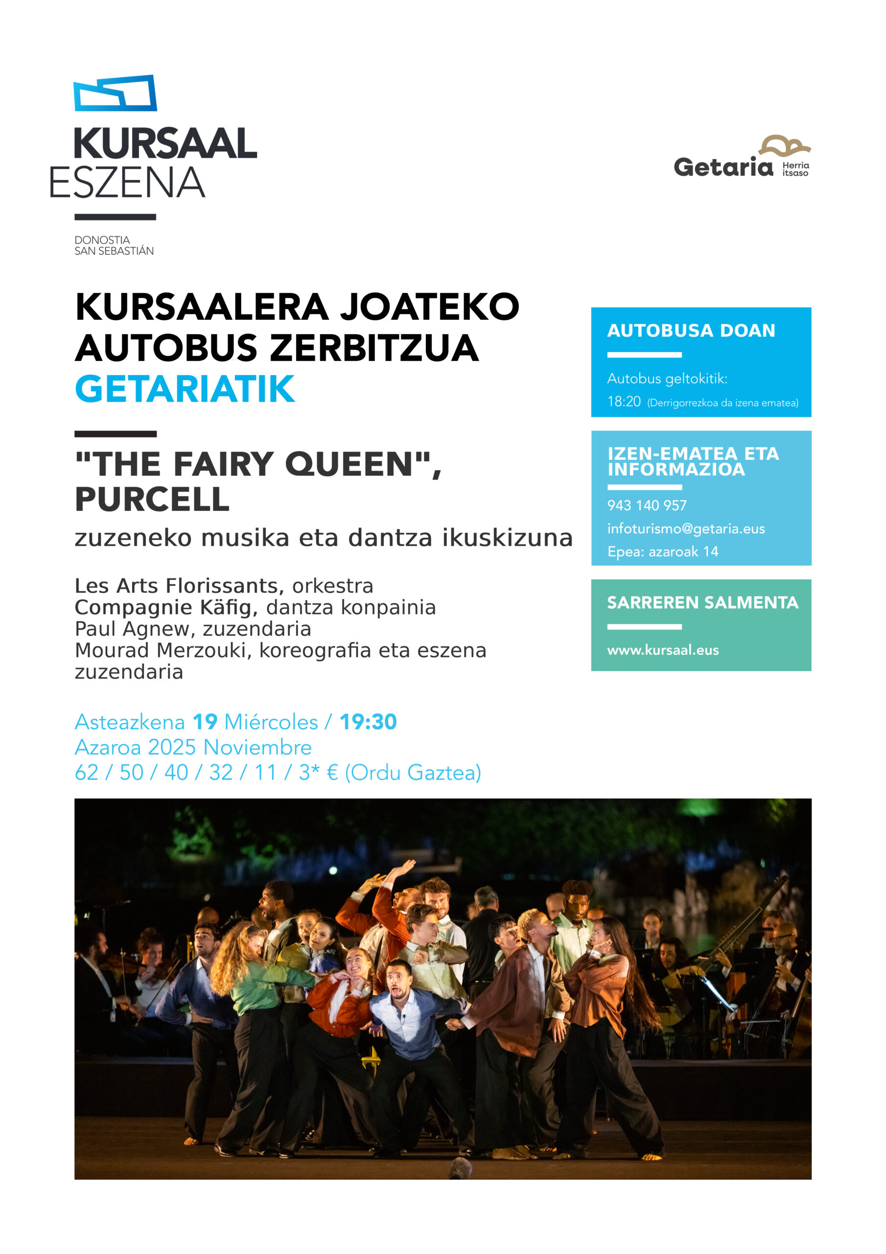 Kursaala Eskura ekimenaren baitan, Kursaal Eszenak “The Fairy Queen”, hip-hop eta dantza garaikideko emanaldira joateko doako autobus zerbitzua jarri du Getariatik.